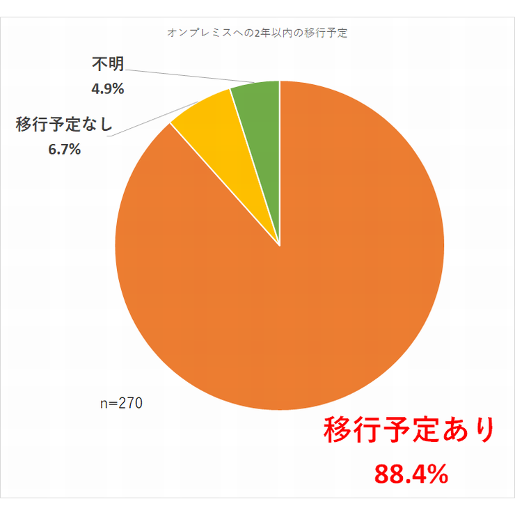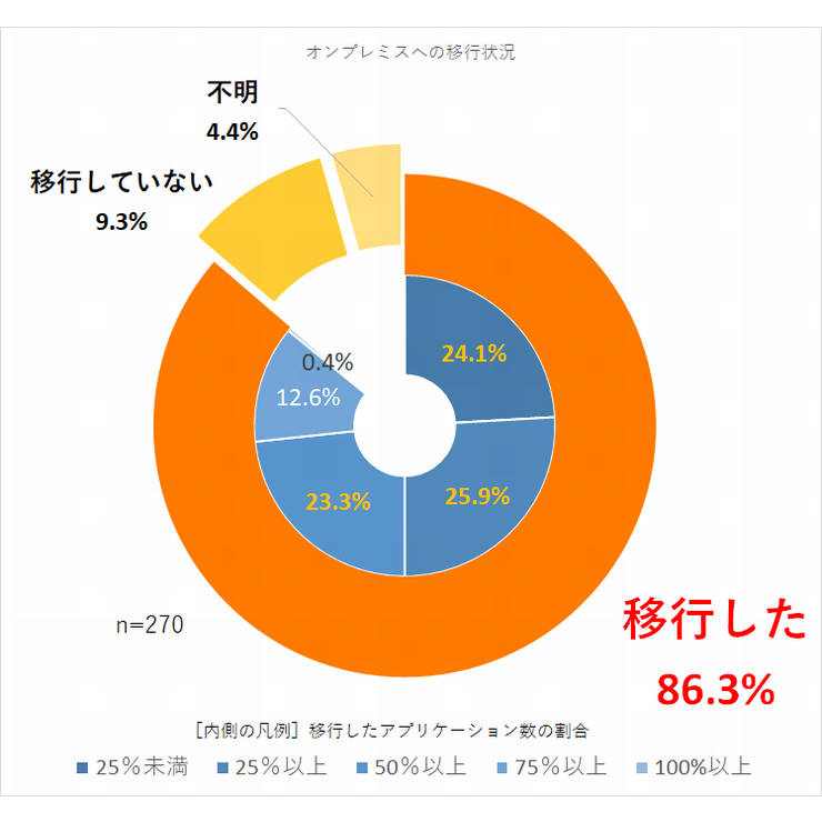 オンプレミスへ移行した内訳をみると、利用していたアプリケーションの75%までを移行した利用者が73.3%と多く、すべてのアプリケーションを移行したとはいえないものの、可能な限りオンプレミスへの移行を進めているといえます。