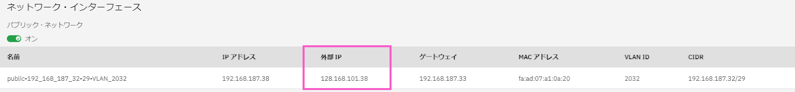 ・「ネットワーク・インターフェース」の項目に記載がある「外部IP」をコピーします。