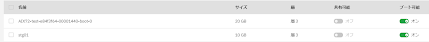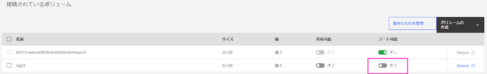 ・「接続されているボリューム」の「stg01」を「ブート可能」にするため「オフ」の部分をクリックします。