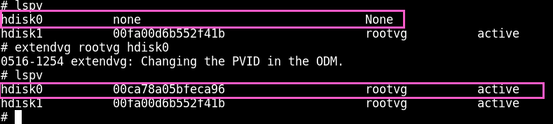 ・再度「# lspv」コマンドを入力し、hdisk0がrootvgに追加されたことを確認します。