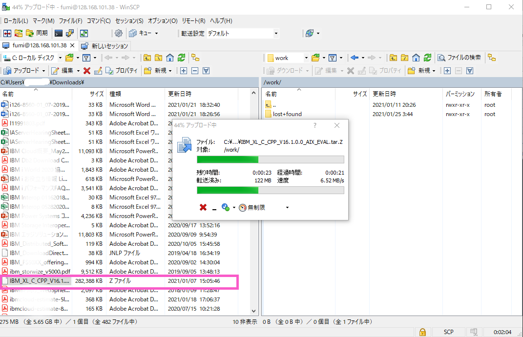・ローカルPCにダウンロードしておいたXL C/C++ソフトウェアを、AIX環境にアップロードします。アップロード先は事前に作成したファイルシステム/work です。