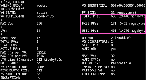 5,472MBの空きがあり、rootvg の容量は20GB(20,448MB)です。