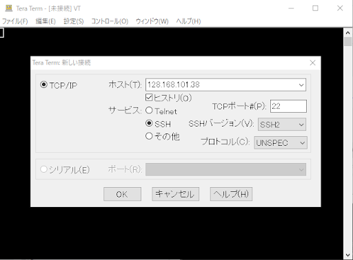 ・「ホスト」にコピーした外部IPをペーストし、プロトコルは「SSH」 を選択して「OK」をクリックします。