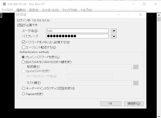 ・作成したユーザとユーザに設定したパスワードを入力し「OK」をクリックします。
