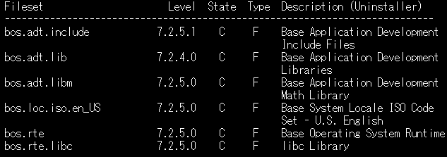 # lslpp -L bos.adt.include bos.adt.lib bos.adt.libm bos.loc.\* bos.rte bos.rte.libc