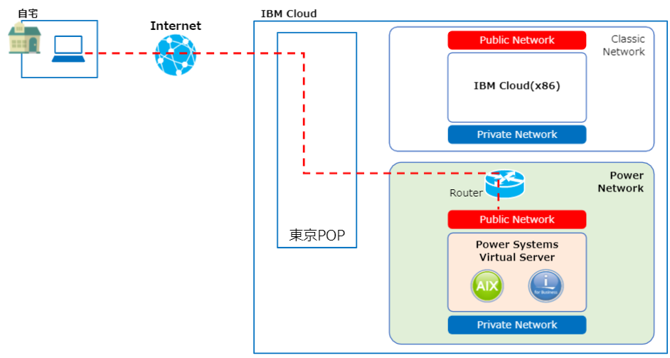 外部IPからの接続はパブリックネットワーク接続となり、イメージ図で表すと以下の赤線です。