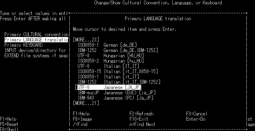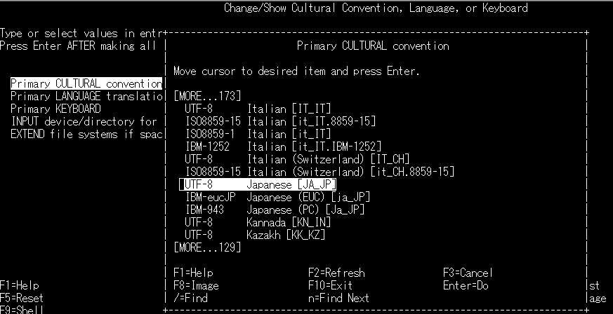 ・リストから「UTF-8  Japanese [JA_JP]」を選択し、Enter を押します。