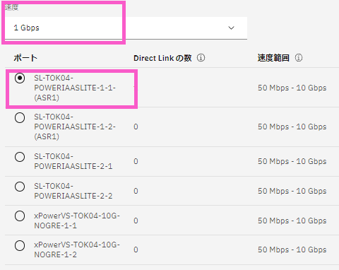 速度は、50Mbps~10Gbps まで8種類から選択可能です。どの速度でも金額は変わりません。IBM推奨は1Gbps以上です。