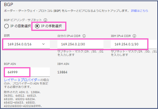 > BGPピアリング・サブネット:「IPの手動選択」を選択