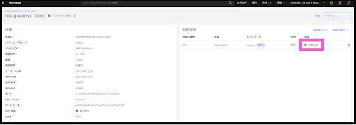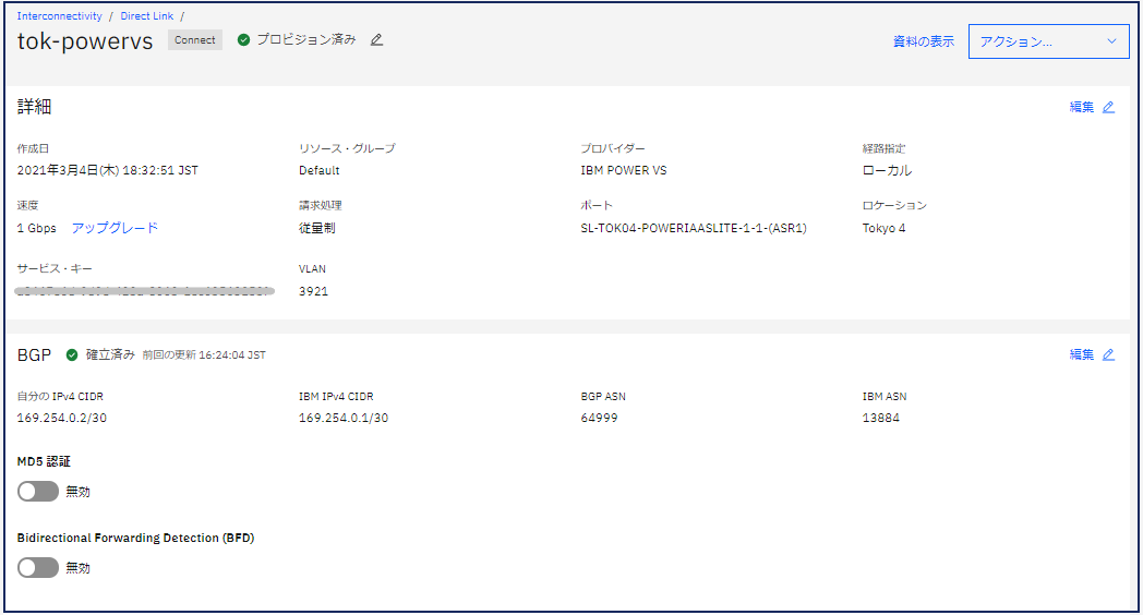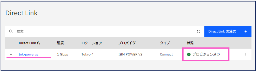 暫く待つと Direct Linkの「状況」が「構成中」→「プロビジョン済み」に代わります。作成したDirect Link名「tok-powervs」 をクリックし詳細画面を表示します。