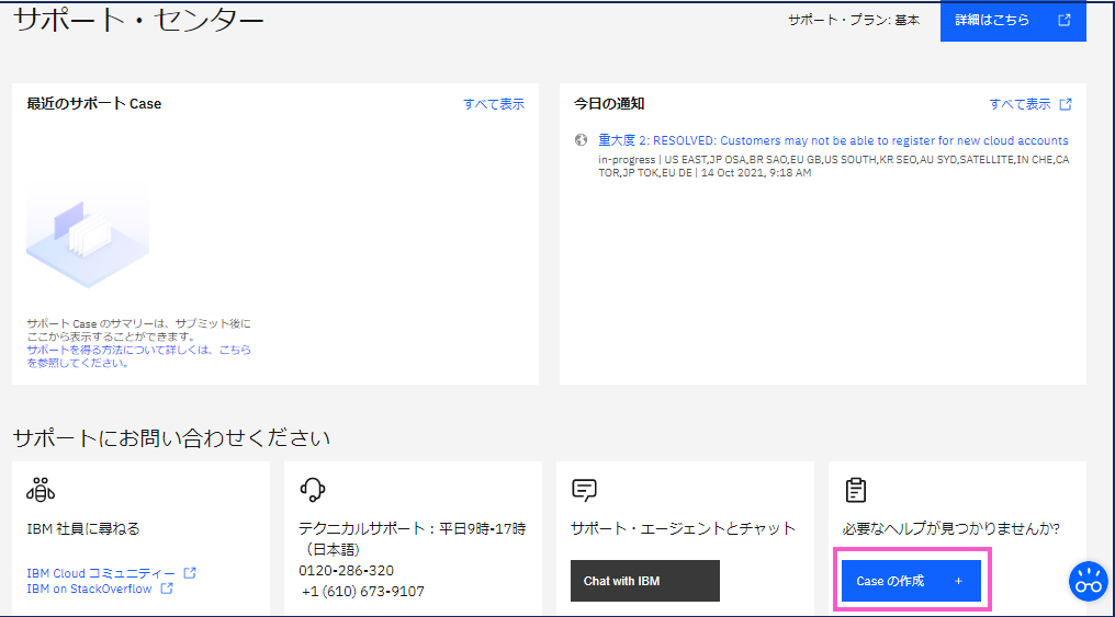 ・IBM Cloud のWEBポータル画面の右上にある「サポート」をクリックします。