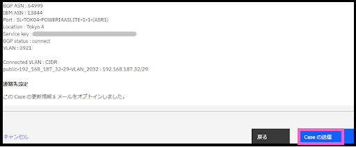 次に、Power Virtual Server のAIX環境とDirect Link Connect の情報を紐付けるための作業を行います。この作業は、IBM Cloud のWEBポータル画面やIBM Cloud CLI 、API からは実施できません。Case を利用して、IBMのSEさん(?) へ接続のリクエストを出します。