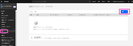 > 左のメニューから「VPC」を選択し、「作成」をクリックします。