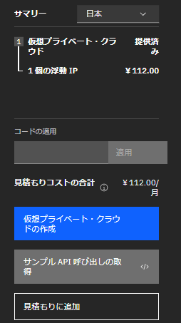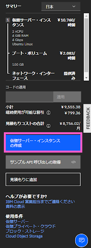 ここまで入力と選択ができたら左画面に出力されているサマリーを確認し「仮想サーバ・インスタンスの作成」をクリックしてVSIを作成します。
