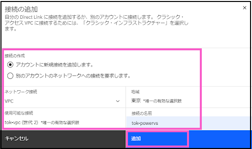 > 接続の名前:tok-powervs(任意の名前)