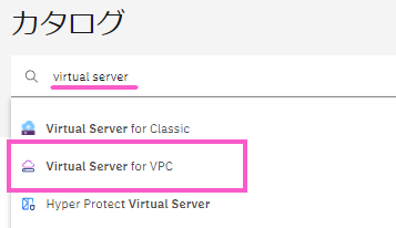 ・「カタログ」に「virtual server」と入力するとリストに「Virtual Server for VPC」が出てくるので選択します。