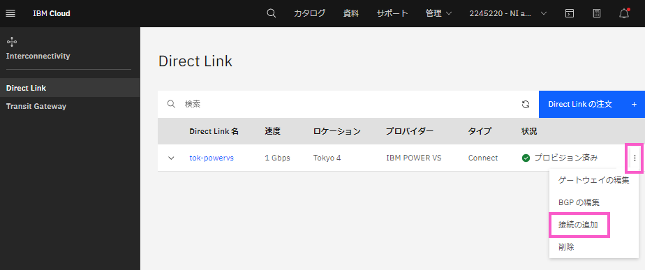 Direct Link Connect と Power Virtual Server は全く別のサービスですので、Direct Link Connect は新規に作成する必要があります。