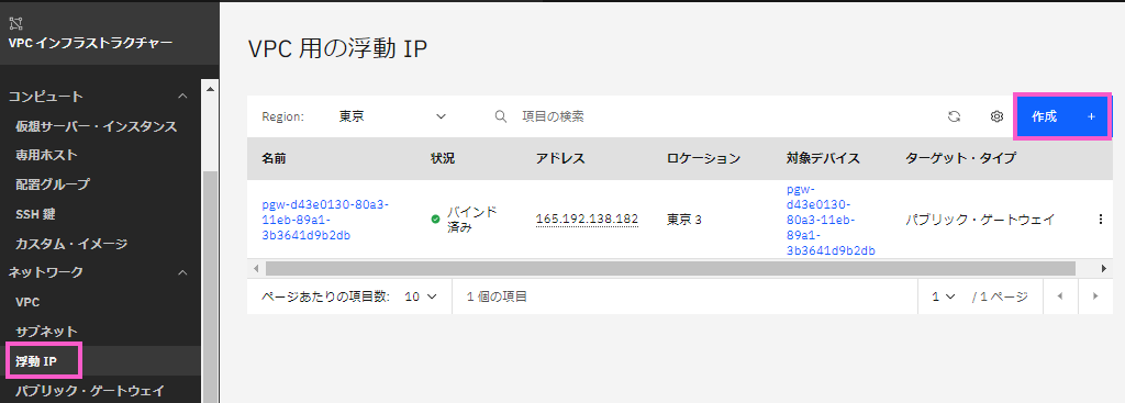 ・「VPC用の浮動IP」の画面で「作成」をクリックします。