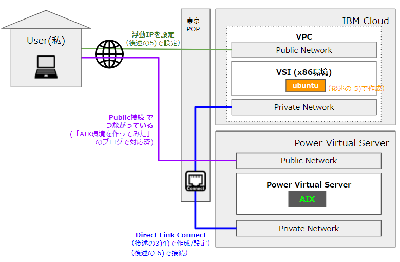 今回は、上記の図の青色の線「Direct Link Connect」 を作成し、オレンジ色のubuntuサーバ(仮想サーバ・インスタンス(VSI))とAIXサーバを接続することが目的です。IBM Cloud環境の「仮想プライベート・クラウド(VPC)」と「仮想サーバ・インスタンス(VSI)」は未作成だったので、新規に作成し手順もブログ内に残しました。