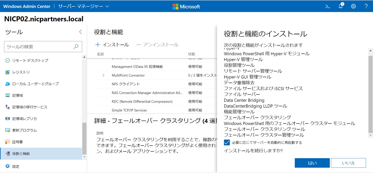 「役割と機能」にて”Hyper-V”、”データ重複排除”、”Data Center Bridging”、”フェールオーバークラスタリング”の4つの役割と機能を選択してインストールします(2台とも)。