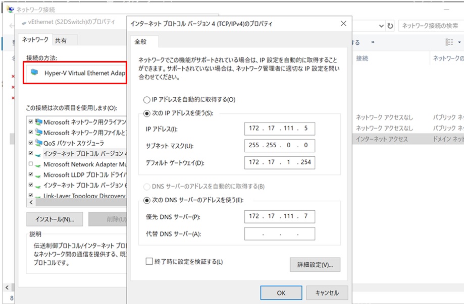 続いてこの”vEthernet(S2DSwitch)”にホストOS用の固定IPを設定します。