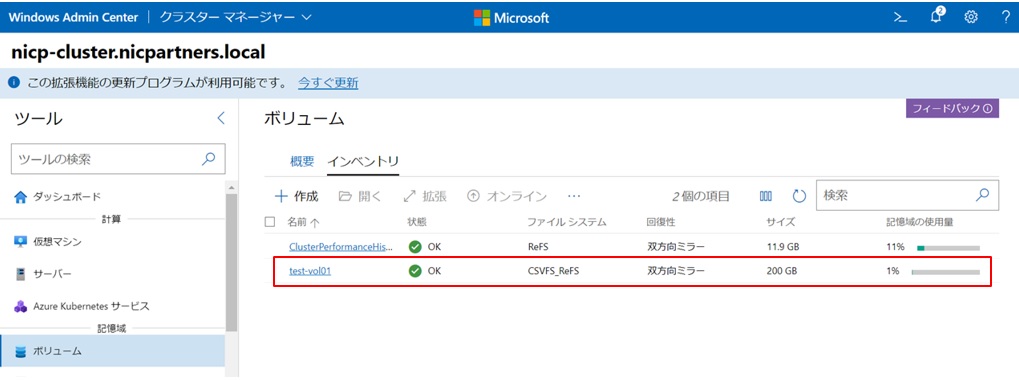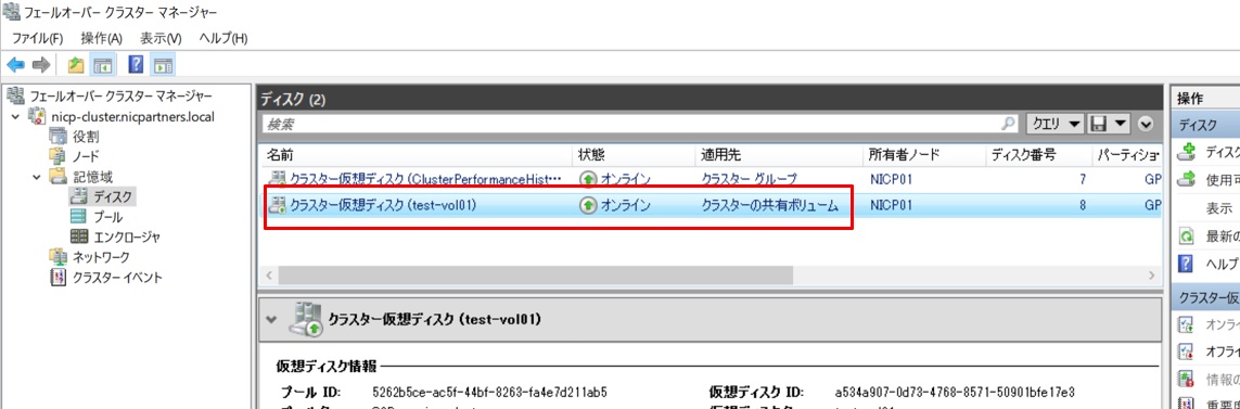 フェールオーバークラスターマネージャーからも確認してみます。このようにクラスタの共有ボリュームとして作成されていることが確認できました。