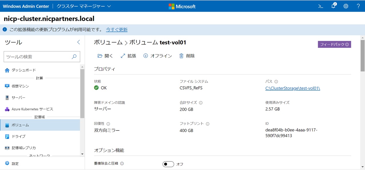 | PS C:\Users\Administrator> Enable-ClusterStorageSpacesDirect 確認この操作を実行しますか?ターゲット ’クラスターの記憶域スペース ダイレクトを有効にします’ で操作’nicp-cluster’を実行しています。[Y] はい(Y) [A] すべて続行(A) [N] いいえ(N) [L] すべて無視(L) [S] 中断(S) [?] ヘルプ (既定値は “Y”): yNode EnableReportName ——- ———————— NICP01 C:\WIndows\Cluster\Reports\EnableClusterS2D on 2021.11.11-14.55.16.htmPS C:\Users\Administrator> |