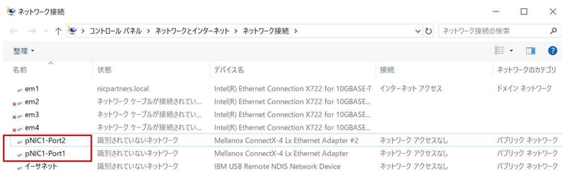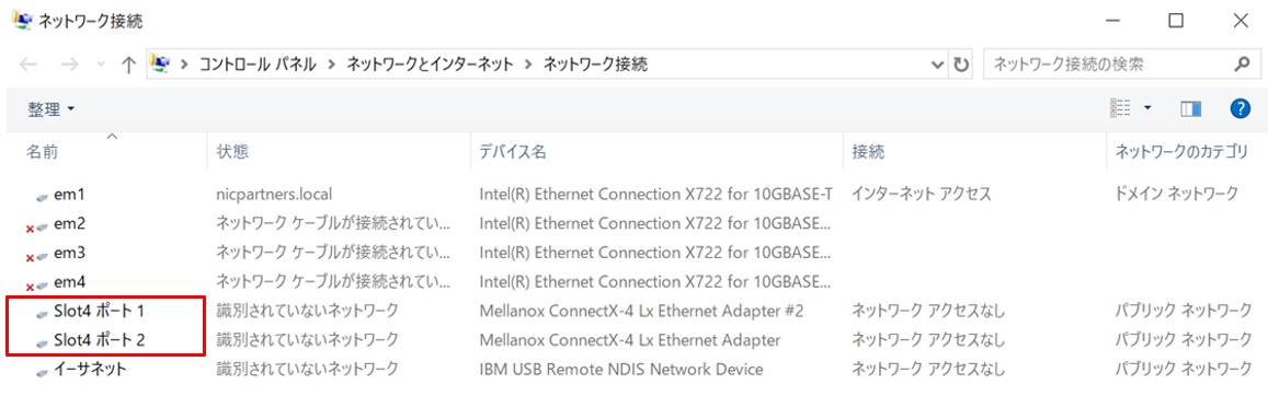 以下はホストOSが認識しているネットワークアダプターです。この後、PowerShellで設定していくので、コマンドの入力をしやすくするために「Slot4 ポート1」「Slot4 ポート2」と言う名前になっているMellanoxアダプターの名前を変更します。