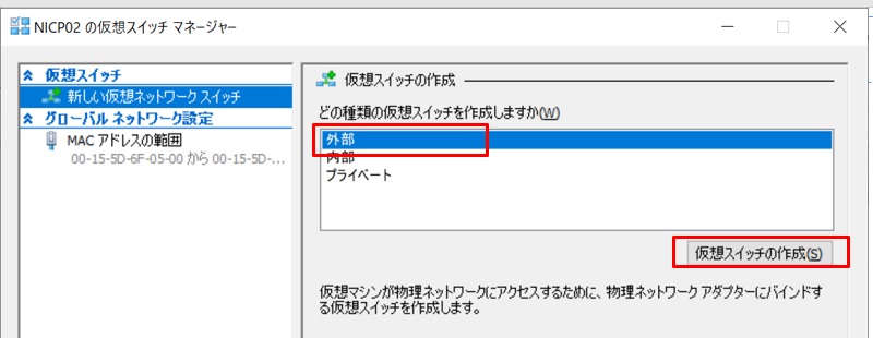 右ペインの[操作] メニューから”仮想スイッチマネージャー”を開き、”新しい仮想ネットワークスイッチ”を選択して、仮想スイッチの種類として”外部”を選択します。