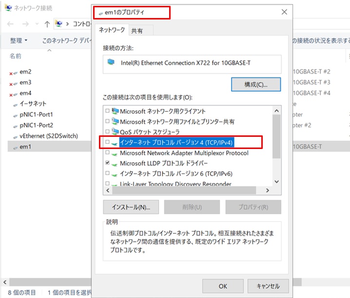 また、物理スイッチに接続した物理NIC(em1)のプロパティを表示し、”インターネットプロトコル バージョン4(TCP/IP V4)”のチェックボックスがオフでIPアドレスが設定できないことを確認します。