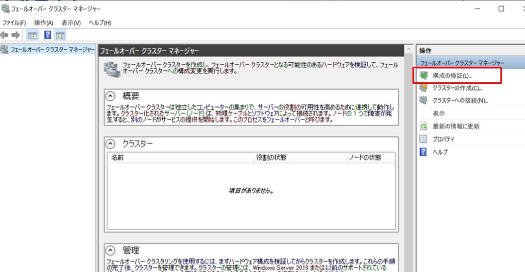 引き続きMXサーバーにリモートデスクトップ接続して設定を進めます。フェールオーバークラスターマネージャーは[スタート] ボタン-[管理ツール] -[フェールオーバークラスターマネージャー] で実行します。起動したら、右ペインの[操作] メニューから”構成の検証”をクリックします。