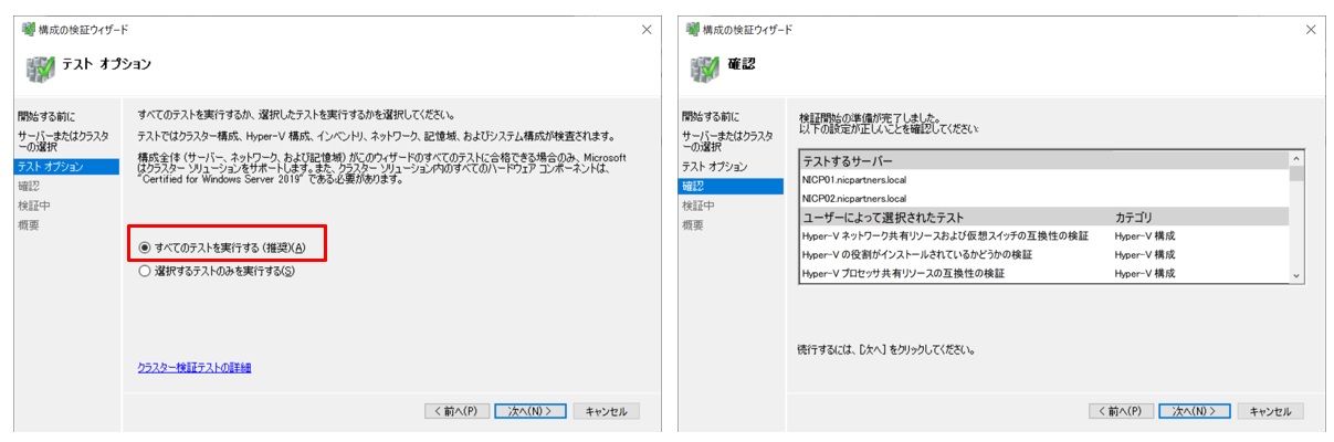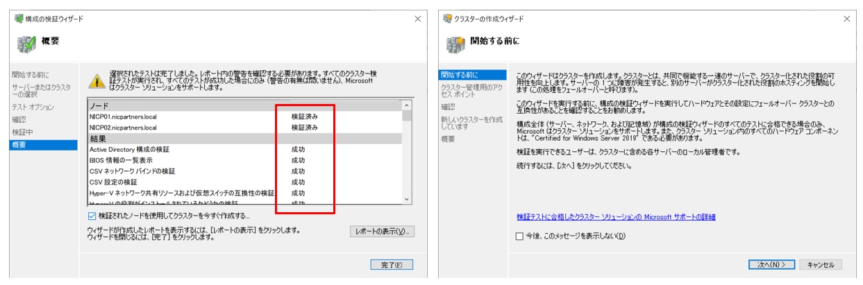 下図のように”検証済み”、”成功”と表示されればテストは完了です。「検証されたノードを使用してクラスターを今すぐ作成する」にチェックを入れて完了します。続けてクラスターの作成ウィザードが始まります。