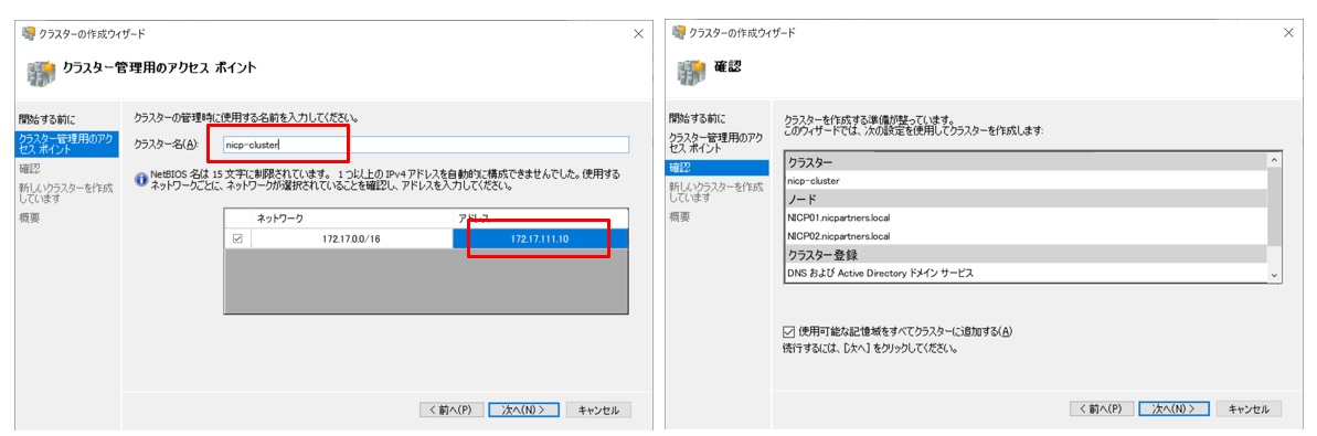 「クラスタ名」と「クラスタ用IPアドレス」を入力し、次の画面で確認します。