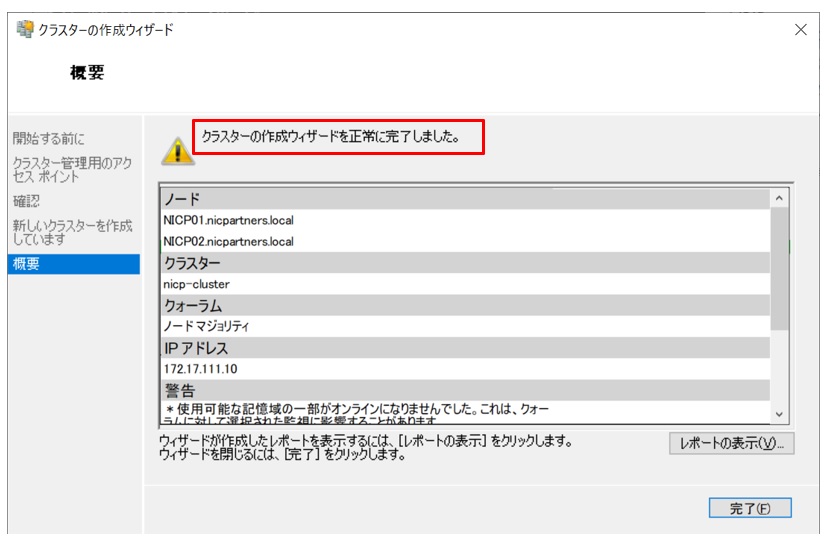 クラスタの作成ウィザードが正常に完了したことを確認します。