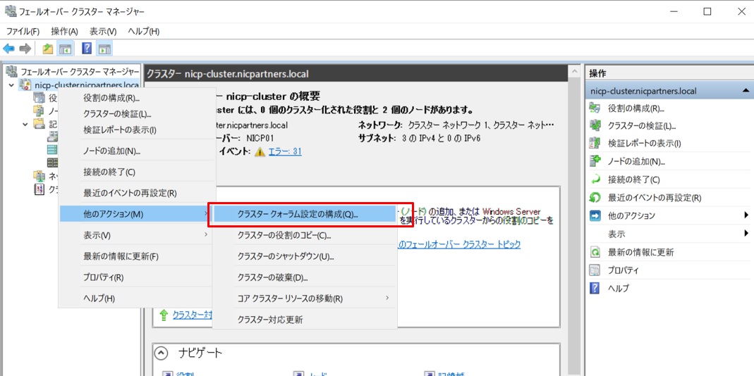 続いて、作成したクラスタ名を右クリックし、”クラスタークォーラム設定の構成”を選択します。