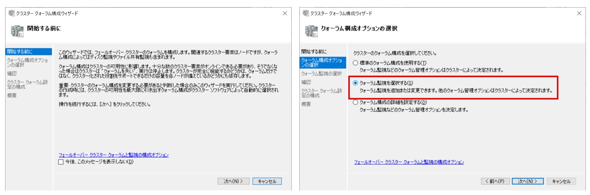 クラスタクォーラム構成ウィザードを実行します。構成オプション選択画面では”クォーラム監視を選択する”を選択します。
