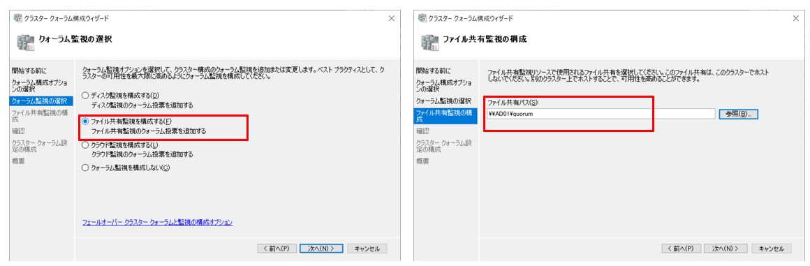 続いて監視の選択画面では”ファイル共有監視を構成する”を選択します。そして次の画面で利用する共有フォルダのぱすを入力します。今回は事前構築したADサーバー(サーバー名:AD01)上に作成した共有フォルダ(¥¥AD01¥quorum)を指定します。