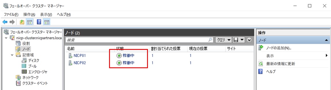 フェールオーバークラスタマネージャーにて、両方のノードが稼働中であることを確認したらここまでは完了です。