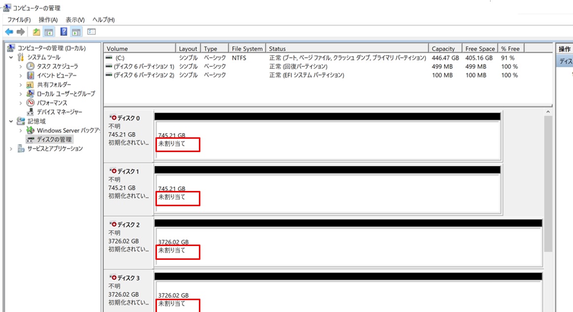 リモートデスクトップ接続したまま、引き続きS2D(記憶域スペースダイレクト)を有効にしてディスクの構成を行います。まず「ディスクの管理」ツールで各ディスクが以下のように”未割り当て”となっていることを確認します。