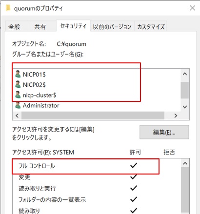 調べると共有フォルダのアクセス権が不足していました。作成した共有フォルダのプロパティ画面の「セキュリティ」タブで2台のコンピュータ名とクラスタ名の3つをコンピュータアカウントとしてアクセス権を”フルコントロール”にして追加します。