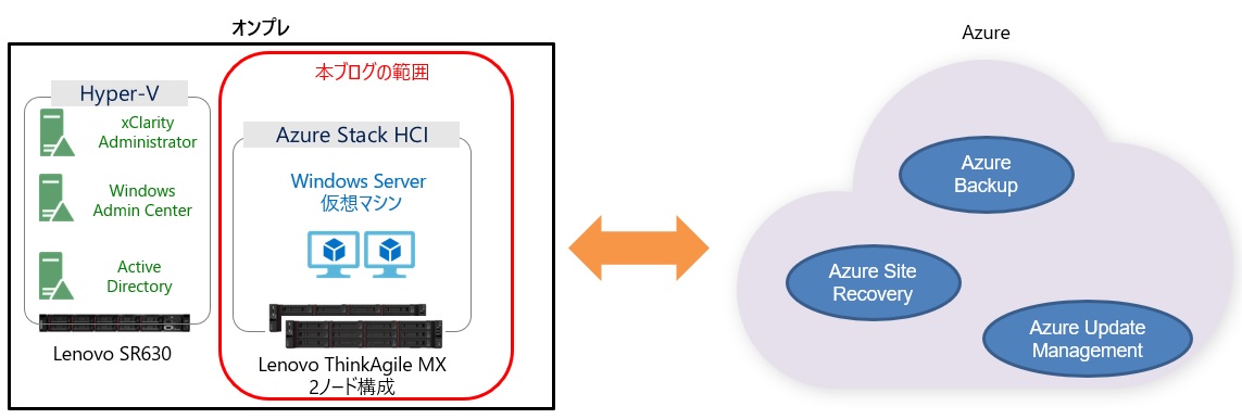 今回の検証環境の概要図はこちらになります。お借りしたAzure Stack HCIのハードウェアはLenovo ThinkAgile MXの2ノード(以下、MXサーバー)になります。もう1台、周辺サーバー用にSR630(以下、Hyper-Vサーバー)もあります。オンプレ側はこれら物理サーバー3台を使用して検証を行いました。