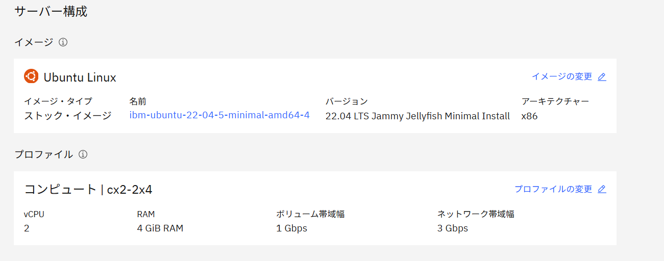 OSはUbuntu 22.04 LTS Jammy Jellyfish Minimal Install、リソースは2vCPU,4GB RAMで作成しました。VSI作成時にSSH鍵が必要なるので作成を忘れないようにしてください。