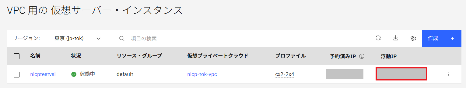 作成すると数分で起動します。端末からSSHログインするため浮動IPが必要になります。赤枠で囲った浮動IPを作成しインスタンスに紐づけします。以上でVSIの作成は完了です。