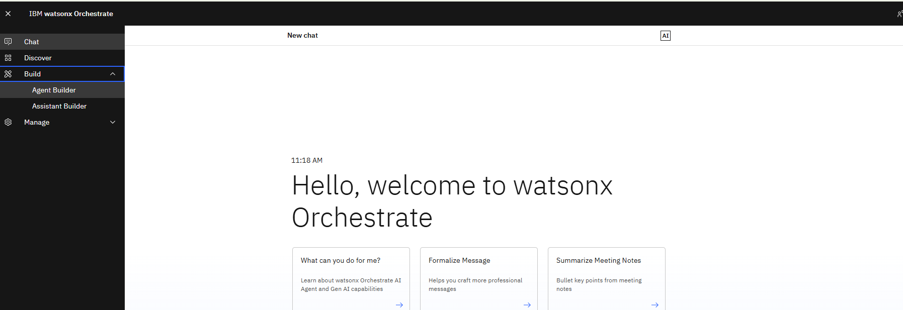 watsonx Orchestrateへログインし、BuildからAgent Builderを選択します。