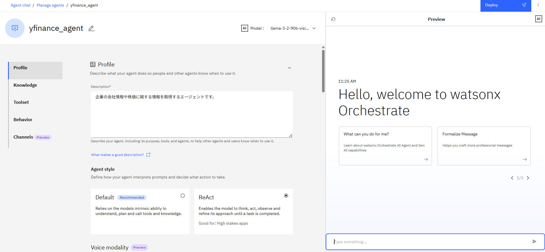 yfinance_age… │ 企業の会社情… │ watsonx/meta- │ react │ │ stock_info, │ │