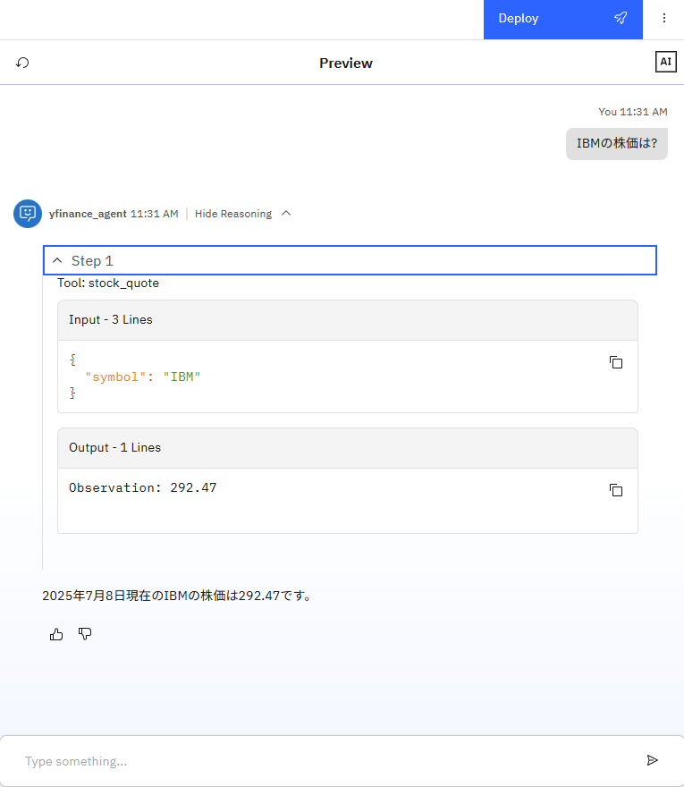 右のPreviewからAgentの動きを確認することができます。今回はDeployせずPreviewで確認します。入力欄には「IBMの株価は?」と質問してみます。しばらくすると本日の株価が回答されました。Show Reasoningを開くと推論過程を確認することができます。株価を取得するTool「stock_quote」を使用し、AIがユーザの入力から自動的にTicker symbolを入力していることがわかります。