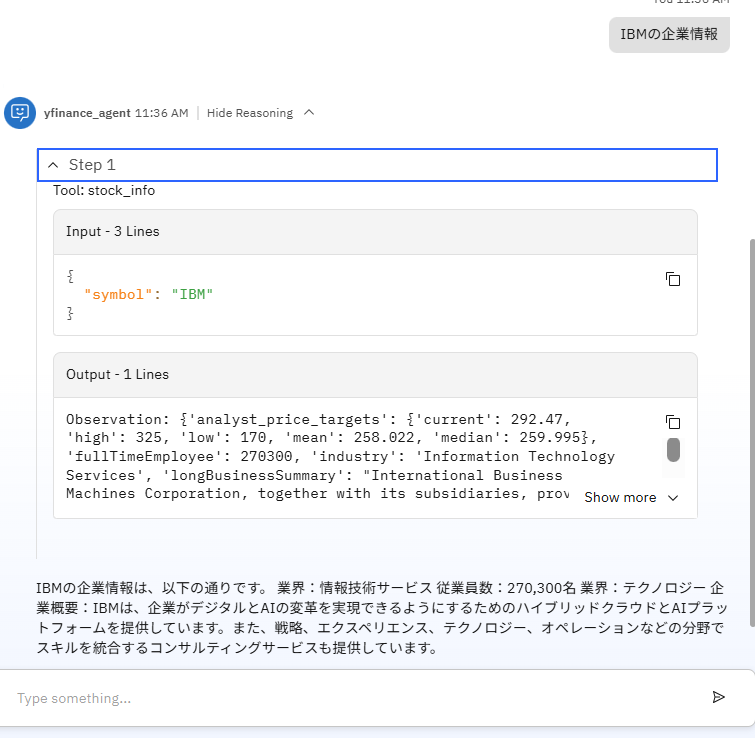 次に「IBMの企業情報」と質問をします。しばらくするとAIがユーザの入力からTicker symbolを入力し、Tool「stock_info」を利用して企業情報を取得、回答されました。ユーザの入力内容からAgentが使用するToolを選択し、実行していることがわかります。