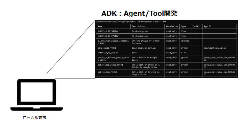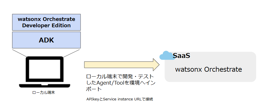 まずはADKについてご紹介します。ADKとは開発者向けにwatsonx OrchestrateのAgentやToolをスクラッチ開発するための開発キットになります。ローカル端末などに導入し、pythonベースで開発を行うことができます。