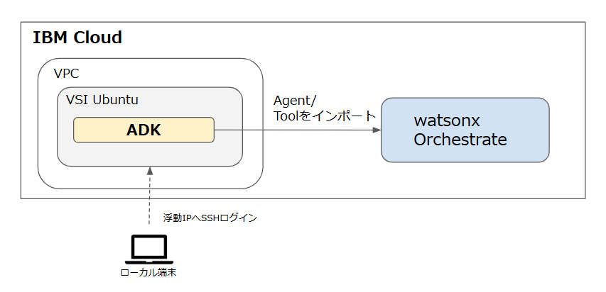 前述ではADKでAgent開発し、watsonx Orchestrate Developer Editionで動作確認、SaaS watsonx Orchestrateへインポートする構築の流れをお話しましたが、今回の検証における動作確認は検証環境として利用しているIBM Cloud 上のwatsonx Orchestrate利用します。よって前述したwatsonx Orchestrate Developer Editionは利用せず、ADKからwatsonx Orchestrate検証環境へAgentとToolを直接インポートし、動作確認を行いたいと思います。また、ADKのインストール先は自分の端末ではなく、IBM Cloud上に構築したUbuntuのVirtual Server Instance(以下、VSI)を使用します。検証環境の構成イメージは下記の図の通りです。