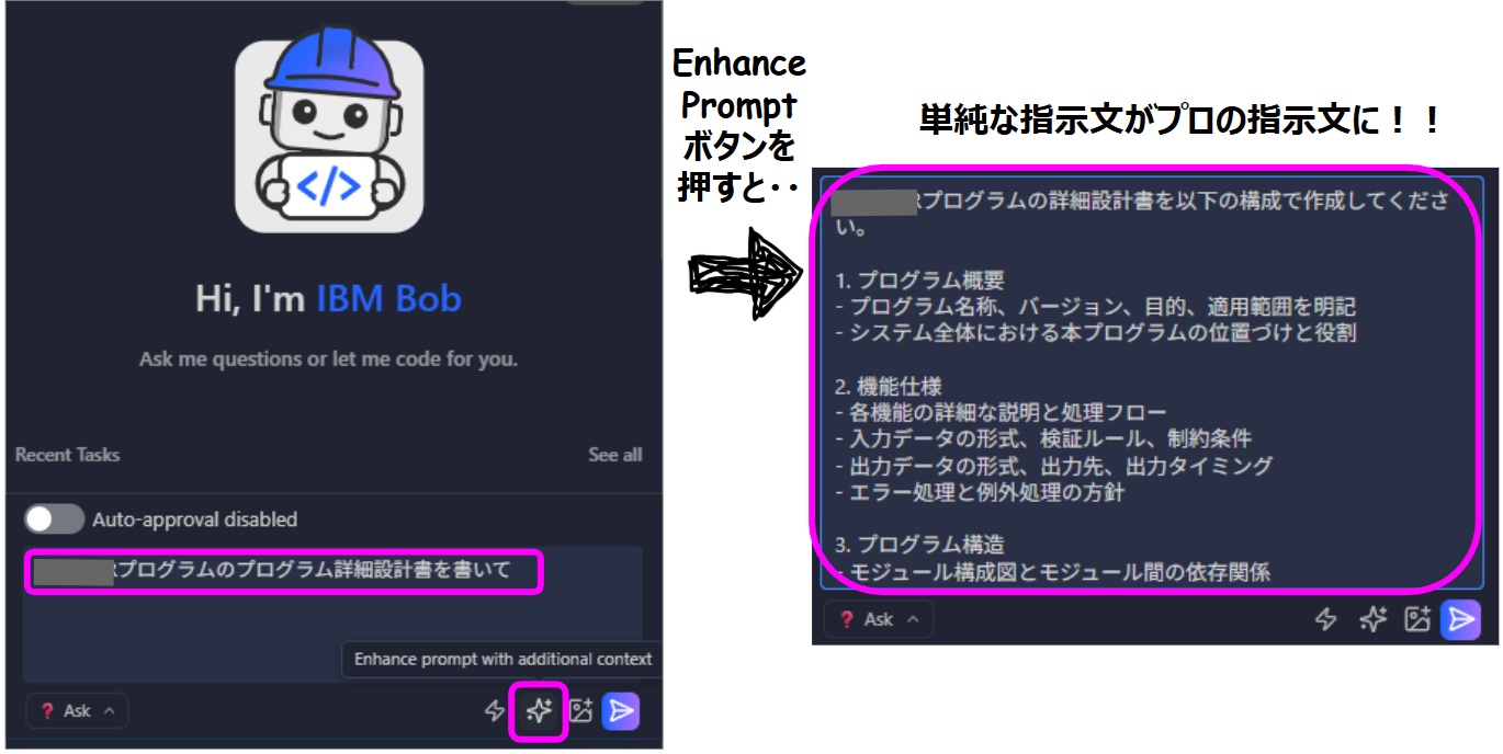 そして、Bobのチャット画面で指示を出す際の「Enhance Prompt(プロンプト強化)」ボタンは非常に便利でした。